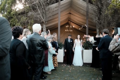 Our serene country wedding chapel provides a magical experience thanks to its lavish back-lit draping, rustic chandeliers and a touch of the outside gardens forming one of the sidewalls. The chapel is covered by a full roof installation.